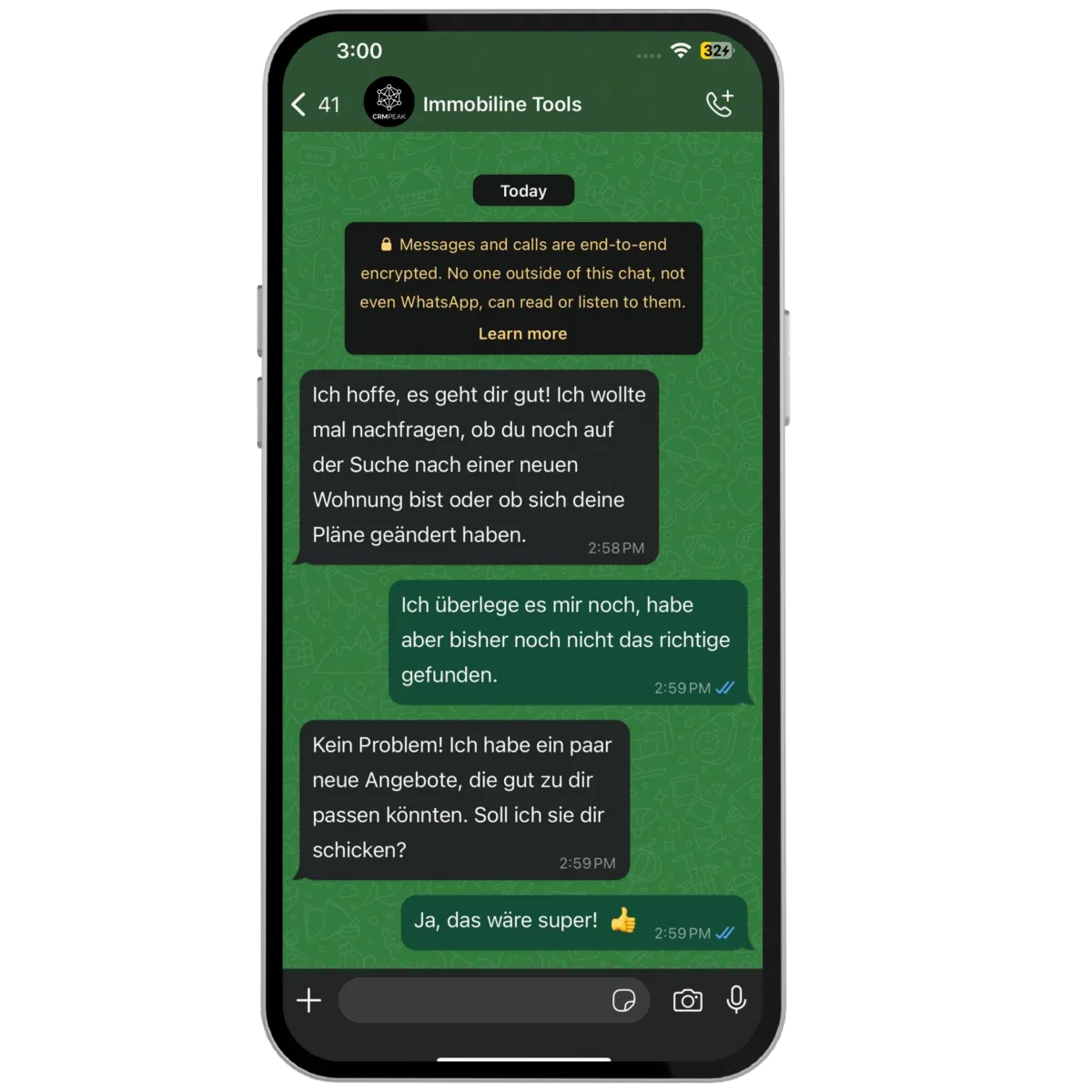 CRMPeak Immobilien nutzt die sogenannte WhatsApp Business API, eine spezielle Version von WhatsApp, die besondere Funktionen für Unternehmen bietet. Falls du einen bestehenden WhatsApp-Account für deine Kunden hast, kannst du diesen einfach übertragen und über CRMPeak verwalten.